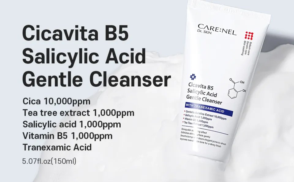 Care:Nel Cicavita B5 Salicylic Acid Gentle Cleanser is a mild foaming cleanser formulated with Salicylic Acid, Vitamin B5, and Centella Asiatica (Cica). It effectively removes excess sebum, dirt, and impurities while keeping the skin calm and hydrated. With gentle exfoliating action, it unclogs pores, smooths skin texture, and helps brighten dullness and reduce the appearance of dark spots.