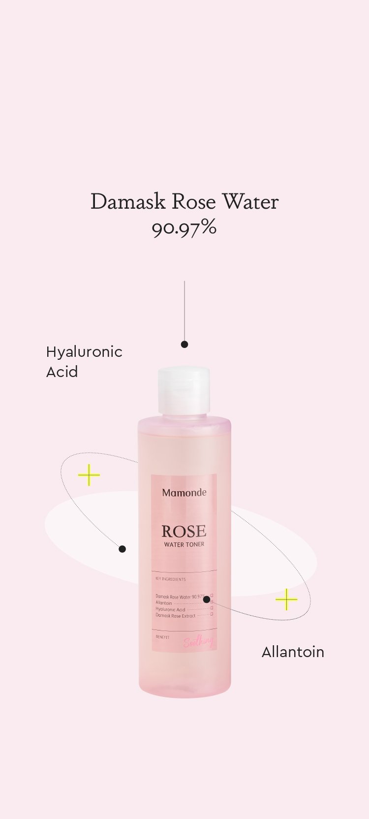 Rose water toner contains 90.97% rose water, instead of regular water, for more soothing hydration with each swip.